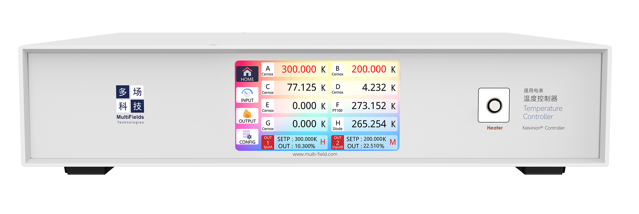 2、多場推出的 "Kelvinion"是?款功能強大的低溫溫控儀。它包括?路獨立的高精度溫度測量通道(支持RTD和Diode類型溫度計)和兩路高達100W+50W的大功率PID輸出通道,以及兩個繼電器輸出和兩個模擬輸出通道。PID閉環(huán)控制、Zone模式、變溫速率設(shè)定和主動過熱檢測等實用功能的加持讓Kelvinion低溫溫控儀成為低溫研究的利器。